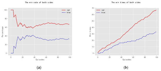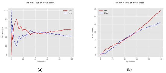 Figure 12. (a) Win rate: the red side is the AI of DQN intelligent algorithm and the blue side is rule-based AI; (b) Win times: the red side is the AI of DQN intelligent algorithm and the blue side is rule-based AI; The winning rate and the number of wins for the red and blue sides. The first round wins so one side starts from 1 and the other from 0.