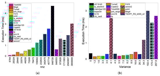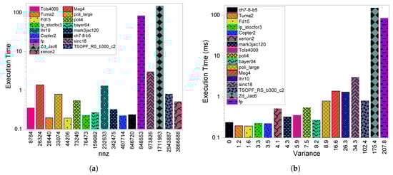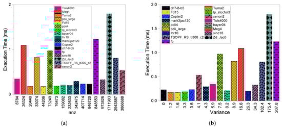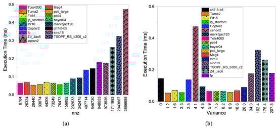 Figure 1b compares the execution time of CSR with respect to variance. We see that, with some exceptions, a consistent increase in execution time as increases. A higher value is defined as a higher variation in the values of each row in a matrix. This leads to load imbalance among the threads when a single thread per row is utilized as seen in CSR. The load imbalance issue is one of the main drawbacks of SpMV computations on the GPU. However, other factors can definitely cause the existing exceptions. For example, in the case of the mark3jac120 and tols4000 matrices, even though the latter has a larger value than mark3jac120, it has a better execution time due to the considerable difference in their values, which are 8784 and 34,2475, respectively. The same is the case for xenon2 and mark3jac120 even though both have structured patterns and similar variances. In this case, mark3jac120 exceeds xenon2 because xenon2 is much larger than mark3jac120 in terms of values. In addition to the value’s impact, the sparsity pattern can also cause exceptions. For example, lhr10 exceeds meg4 despite its larger value because meg4’s sparsity pattern is more complex than lhr10’s in terms of distribution. This is clear if we examine the differences between the anpr and max_npr features, which are larger in meg4 compared to lhr10.