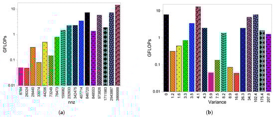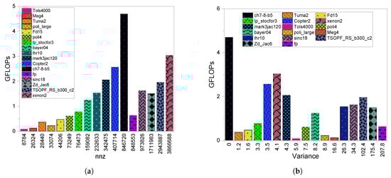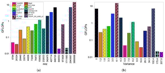 Figure 12b shows the values for all the matrices and their achieved GFLOPS. As discussed, the matrices with the highest variances achieved the lowest GFLOPS and they are Zd_Jac6 and fp. In addition, from Figure 12b it is clear that the matrices with the lowest attained the highest GFLOPS compared to the matrices with the highest values. Certainly, there are some exceptions due to other sparsity factors. One case involves TSOPF_RS_b300_c2 and sinc18, where TSOPF_RS_b300_c2 attained higher GFLOPS than sinc18 although it has bigger variance. This is because TSOPF_RS_b300_c2 has a bigger than sinc18. The same occurs between lp_stocfor3 and copter2 and between poli4 and tols4000.