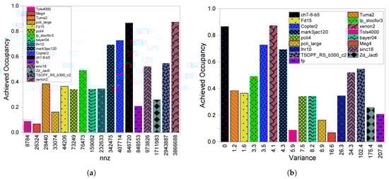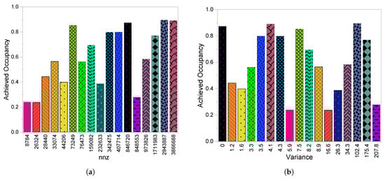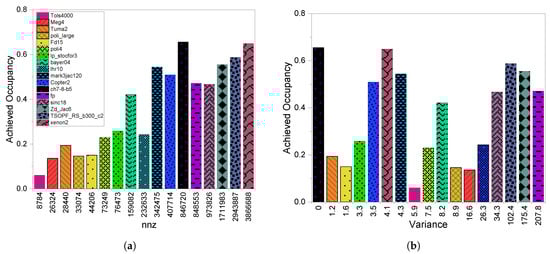 Figure 3a,b report the results of the achieved occupancy of the CSR scheme. AO affects the performance since it indicates the rate of GPU SM utilization. More exploitation of GPU parallelization capabilities improves the overall performance. Generally, from Figure 3a, a higher leads to better achieved occupancy, but then we observe a few matrices with higher and lower achieved occupancy. Consider fp and zd_Jac6, both which have a large number of but attained low achieved occupancy. This is also the reason for the higher execution time for these two matrices. We reason that the features of the sparsity structures include , and the existence of gaps per row on the matrices. The last two conditions are in existence since we have a big for both matrices and there exists gaps within a row. The first three matrices have lower achieved occupancy since they are considered the smallest matrices in terms of . The highest occupancy is attained by ch7-8-b5 and xenon2, where all the conditions are satisfied (i.e., large number of nnz, low variance, and small gaps in the rows).