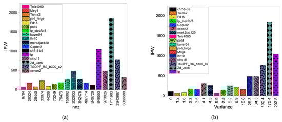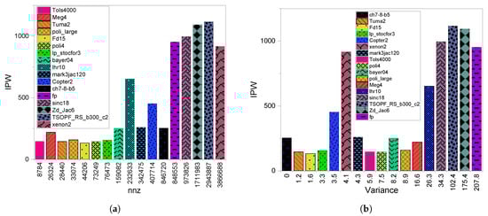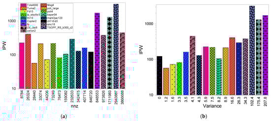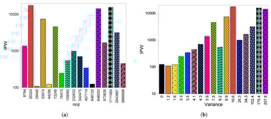 In Figure 14a, where we see the impact of on the IPW metric, we note that there is oscillation between the lows and highs, the tendency to have a high IPW value with a higher can be observed. Analyzing some case studies will clarify this variation. If we take sinc18, meg4, and xenon2, which have similar IPW values and big differences in nnzs (26324, 973826, and 3866688, respectively), we conclude that the does not play an important role in IPW value. This leads to the conclusion that the sparsity features definitely have a strong impression on the level of divergence we have on this scheme. This is further clarified in Figure 14b.