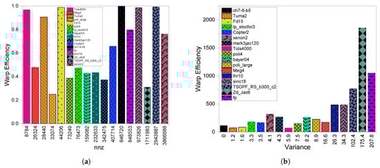 From Figure 13a, a higher leads to better achieved occupancy, but we observe a few exceptions. Let us consider sinc18 and ch7-8-b5, both which have a larger number of nnz, but sinc18 attained a lower achieved occupancy compared to ch7-8-b5. This may also be considered a clarification of the sinc18 matrix’s high execution time. We might deduce again that the main features of the sparsity structures are the nnz, variance, the existing gaps per row on the matrices, or the difference between anpr and max-npr. Again, looking to sinc18 and ch7-8-b5 sparsity structures, starting with we find that the of ch7-8-b5 is lower than sinc18, which are 0 and 34.32, respectively. Thus, less leads to better achieved occupancy besides large nnz. This is further clarified in Figure 13b.