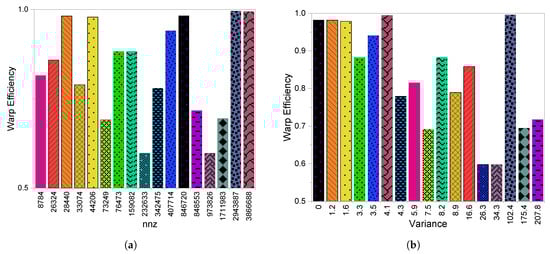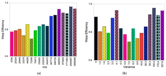 Figure 4a,b shows the instructions per warp (IPW) for the CSR scheme. Figure 4b illustrates that with higher values (which means a large variation of number of per rows) we have a higher IPW, which indicates a higher divergence. However, in some cases such as Zd_Jac6 and fp, although the of fp is larger than Zd_Jac6, Zd_Jac6 has higher IPW due to larger than fp. The same happens for mark3jac120 and xenon2, where the latter is a little higher than the former. Moreover, tols4000 has fewer IPW than mark3jac120 and xenon2, although its is higher than mark3jac120 and xenon2, but this is due to its small nnz. So, we can conclude that with more variation per row in a matrix we have more divergence and therefore low performance while taking into consideration the matrix size in terms of nnz. In addition to the IPW metric to detect the existing divergence, we have the warp execution efficiency metric. In case of warp divergence some threads will be permanently switched off for various reasons such as, the presence of conditional control statements (which cause MIMD) or uncoalesced memory access (which causes waiting time to bring the data in different memory transactions). These factors affect the active threads within a warp because they result in work variation within a warp and this sometimes serializes the work as GPU is an SIMD device. Thus, warp efficiency metric provides a deep understanding of GPU utilization and indicates the level of parallelism exploited. High warp efficiency percentage indicates a high level of thread exploitation, and low warp efficiency indicates the existence of divergence.