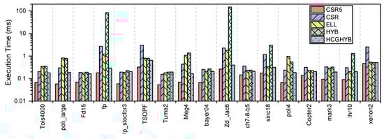 Figure 16b plots a comparison between execution time and for the CSR5 scheme. We observe a variation in the values and it tends to have longer execution times with the larger values. The matrices mark3jac120 and xenon2 with values 4.36 and 4.11, respectively, are exceptions. Although mark3jac120 has larger than xenon2, it achieves better execution time due to its smaller value compared to xenon2. The same happens for fp and Zd_Jac6 because Zd_Jac6 has a bigger than fp. This again be observed again in case of mark3jac120 and bayer04, with the latter’s superiority due to its smaller value. All these examples are evidence of the bigger impact values has on the execution time than the impact of values has on the execution time for CSR5.
