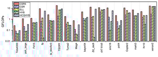 Figure 2a,b illustrate the GPU throughput of the CSR scheme with a comparison of each matrix values. Figure 2a shows a regular increase in the first twelve matrices, followed by a break at the fp matrix and a subsequent return to increasing GFLOPS. The rest of the matrices after the peak GFLOPS values (i.e., ch7-8-b5 and copter2) are fp, sinc18, Zd_Jac6, TSOPF_RS_b300_c2, and lp_stocfor3. Although xenon2, is the larger matrix in terms of and has a structured pattern, the unstructured matrices ch7-8-b5 and copter2 exceed it and have higher GFLOPS values. We noted that the sparsity pattern plays an important role in this variation.