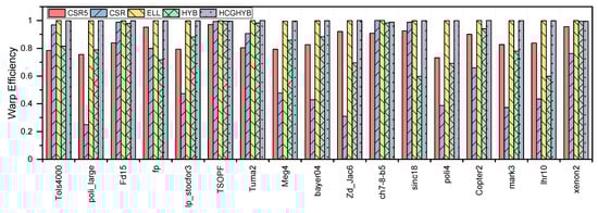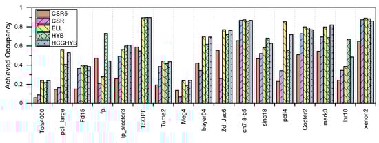 Figure 13a,b report the results of the achieved occupancy of the HYB scheme. This metric affects the performance since it indicates the rate of GPU SM utilization. More exploitation of GPU parallelization capabilities equals better performance.
