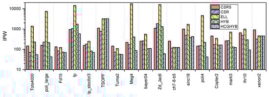 In Figure 9b, we can see that with higher values we have a high IPW, which indicates a higher divergence with some exceptions. As an example, for poli4 and bayer04 (where the variances are 7.57 and 8.2, respectively), the divergence level on bayer04 is less than poli4 despite its bigger variance. This is due to the big difference between anpr and max-npr of 2 and 304, respectively, on poli4, while they are 7 and 34 on bayer04, respectively. This factor will cause divergence as explained earlier, and this is mainly because ELL depends on the max-npr to determine the size of the matrix row. The same occurs with meg4 and lhr19 where the is 16.66 and 26.37, respectively. meg4 has an anpr and max-npr of 4 and 1193, respectively, while lhr10 has 21 and 63, respectively.