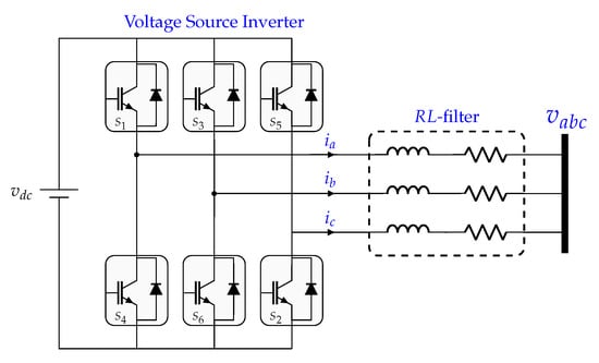 where l and r are the parameters of the resistive-inductive (RL) filter, and correspond to the currents flowing through the filter in the -reference frame, and represent the average the modulation indexes, and are the voltages of the AC network, and corresponds to the angular frequency of the grid voltages.