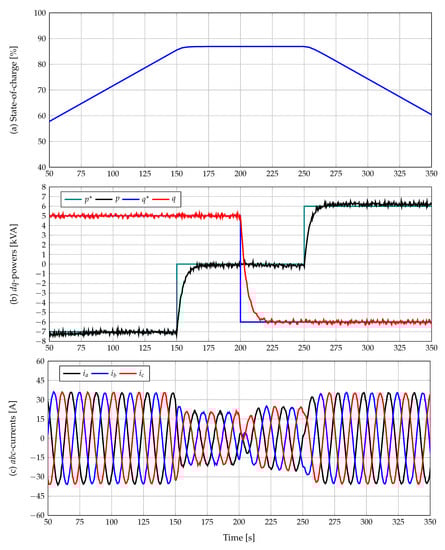 Independent active and reactive power control: (a) state-of-charge behavior, (b) active and reactive power in the reference frame, and (c) three-phase currents.