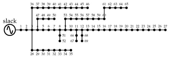 This test feeder is composed of 69 nodes and 68 branches, with an operative voltage of kV at the substation, which is located at node 1. The amounts of active and reactive power consumption in this test feeder are kW and kVAr, respectively. The electrical configuration of this test feeder regarding nodal connections is presented in Figure 4. In addition, all the branches and nodal information regarding active and reactive power are reported in Table 3, where columns have the same interpretation of the 33-node test system.