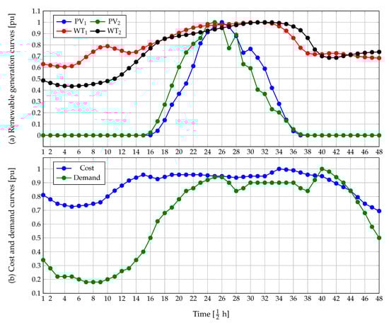 Operational curves for day-ahead economic dispatch approach: (a) renewable generation, and (b) demand and cost curves [].