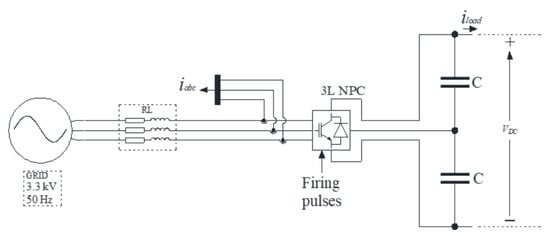 The designed system is presented in Figure 2. The system consists of a three-level three-phase active front end connected to the three-phase voltage source, where RL is a model of a grid and step-down transformer impedance, C is the DC link capacitors and is the DC link current (load current). The active front end is based on five switching states in the first quarter of the fundamental harmonic period.