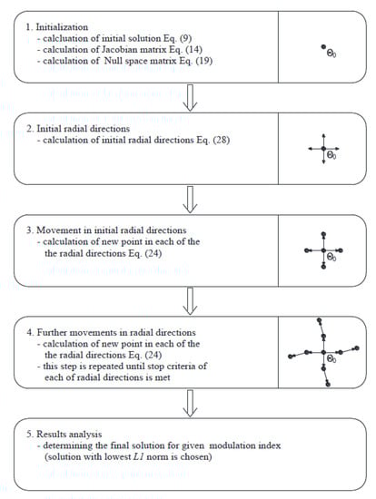 Figure 4 shows the flowchart of the BF method. The first step of the BF method is initialization, in which the method calculates the initial solution with the NR method for the given modulation index (m). This initial solution is the solution of Equation (9) which satisfies all the additional constraints (angles are in specified order and minimum on/off switching time is obeyed). After the initial solution is found, the method calculates the Jacobian matrix (Equation (14)) and null space of the Jacobian matrix (Equation (19)). The second step of the BF method is calculation of the initial radial direction (Equation (28)), in which the method will begin to search the feasible solutions. In the third step, the method moves in the radial directions and determines the new solutions. The method in the fourth step searches further in radial directions for new solutions, and this step is repeated until one of the stopping criteria is met. In the fifth step, all the determined solutions are analyzed, and the optimal solution is chosen (solution with the lowest norm).