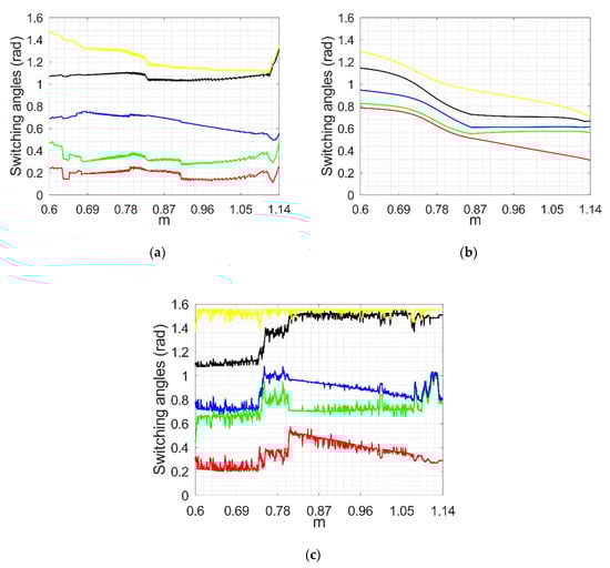 The BF method described in Section 3 is implemented in GNU Octave. The calculation of the pulse patterns is done for the modulation index (m) in the interval with the resolution of . The minimum on/off switching time is set to , which corresponds to the 0.0314 rad for 50 Hz frequency of the fundamental harmonic. The maximum deviation of the switching angles between two neighboring modulation indexes (m) is set to 0.04 rad to ensure the continuity of pulse patterns. The BF method starts the search in 100 radial directions from the initial solution, where the maximum number of solutions is set to 10,000. The calculation is conducted for the grid voltage of 3.3 kV (line to line RMS value). To demonstrate the effectiveness of the BF method, the authors also present results for an optimization problem defined with Equation (8) obtained with the NR method and particle swarm optimization (PSO) method. Results obtained with the NR method are actually initial solutions for the BF method as stated in Section 3, i.e., they represent the starting point for the BF method from where the method starts to search for more optimal solutions considering the defined norm. The PSO method based on swarm intelligent algorithms is an optimization tool for unconstrained optimization problems. Due to this, constraints defined in the optimization problem in Equation (8) are added to the cost function in the form of penalty functions. The PSO method is initialized with a population number of 100 particles with the maximum number of iterations set to 400. Constraints regarding the minimum on/off switching time and maximum deviation of the switching angles between two neighboring modulation indexes (m) are the same as for the BF method.