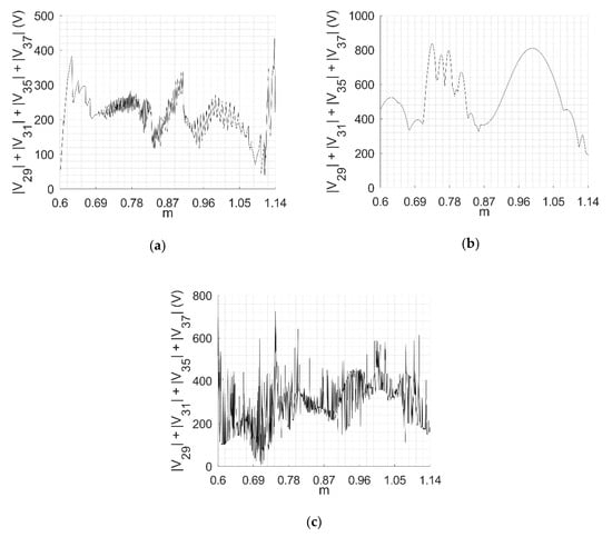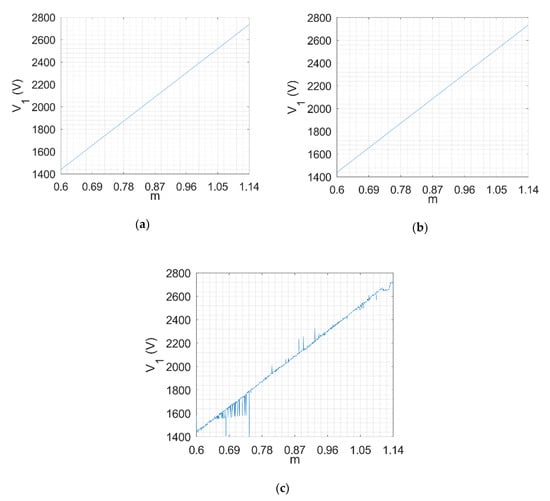 Figure 6 shows the calculated norms for the BF method (Figure 6a), NR method (Figure 6b) and PSO method (Figure 6c). Comparing these three norms, a conclusion can be made that the NR method has the highest norm through the whole range of the modulation index (m) in regard to the BF and the PSO methods. Although the norm of the BF method (Figure 6a) and the PSO method (Figure 6c) seems to be similar, calculating the average value of norms of both methods reveals that the average value of the norm of the BF method is 214.26 V, and the average value of the norm of the PSO method is 298.62 V (in the given range of the modulation index (m)).