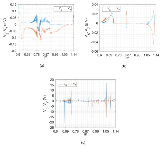 Figure 8 shows the fifth and the seventh harmonics obtained with the BF method (Figure 8a), NR method (Figure 8b) and PSO method (Figure 8c). Based on these figures, it can be stated that the BF and NR methods have the smallest fifth and seventh harmonics and that their values never exceed 0.17 mV. When you consider that the first harmonic has much higher amplitude, these fifth and seventh harmonics have almost no influence. The fifth and the seventh harmonics of pulse patterns calculated with the PSO method (Figure 8c) have much higher amplitude than the harmonic whose pulse patterns are obtained with the BF or NR methods. The reason for this is that the PSO method did not converge on the optimal solution for some values of the modulation index (m).