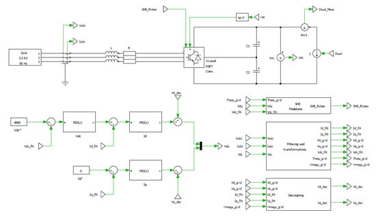 The simulation schematic in Figure 9 consists of two parts, namely the power part and the control part. The power part consists of the 3 LV NPC AFE and corresponding DC link. The DC link is constructed from two capacitors and a current source for load simulation. The AC side of the 3 LV NPC AFE is connected to the grid power supply through grid impedance LR. The control part consists of an internal current and an external voltage loop. The internal current loop consists of two current PI regulators for regulating the currents in the d-q rotating reference frame synchronous with the grid voltage. The external voltage loop is a PI regulator for regulation of the DC link voltage. PI regulators are tuned by a trial and error method and by authors’ experience. Signals and are decoupling signals between the d and q axes. The SHE Modulator block in Figure 8, based on voltages on the direct and quadrature axes and DC link voltage, calculates firing pulses for the 3 LV NPC AFE converter. Calculation of firing pulses is based on pulse patterns calculated with the BF method presented in Section 3. Block Filtering and transformations filters the measured values (grid voltage and current and DC link voltage) and transforms the grid voltage and currents into a d-q rotating reference frame. Block Decoupling calculates the decoupling signals based on the grid impedance.