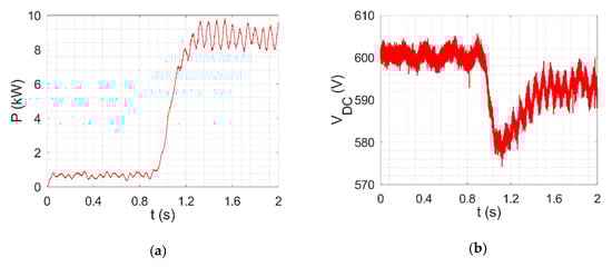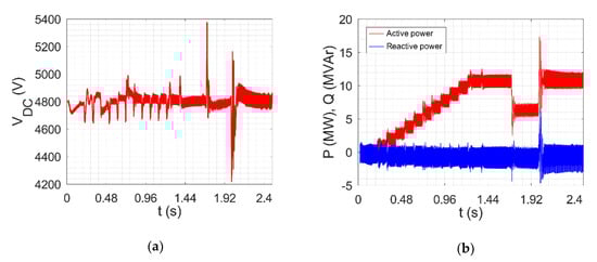 The simulation starts with the 3 LV NPC AFE in no load condition and then the load is gradually increased to the rated load. In the simulation time of 1.7 s, the load is reduced by 40% of the rated power and then in the simulation time of 2 s is increased back to 100% of the rated power. The load is simulated with the current source. Figure 10a shows a dynamic response of the DC link voltage, and Figure 10b shows active and reactive power. Simulation results clearly show that with the determined pulse patterns, the simulated system is stable during transients and in steady state, even if the load is suddenly reduced by 40% and then increased suddenly back to 100% of the rated power.