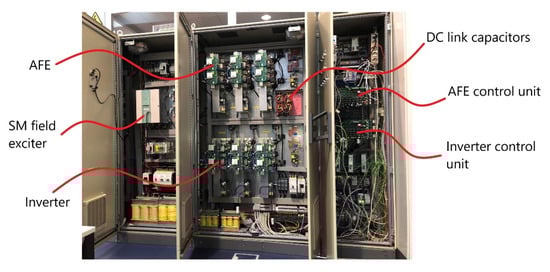 Verification of pulse patterns obtained with the BF method was done on a low-voltage 3 LV NPC AFE converter. The modulation technique for the 3 LV NPC AFE converter is SHE-PWM based on five switching states in the first quarter of the fundamental harmonic. The rated power of the 3 LV NPC AFE converter is 55.4 kVA (Appendix B) and it is connected to the 400 V, 50 Hz grid. The DC link consists of two capacitors as in Figure 2, and it is connected to the inverter. The inverter modulation technique is space vector PWM with a switching frequency of 1.25 kHz. The inverter is connected to the synchronous motor (SM) of 18.5 kW of rated power. The shaft of the SM is connected to the DC motor to generate load torque. The experimental system is shown in Figure 12.