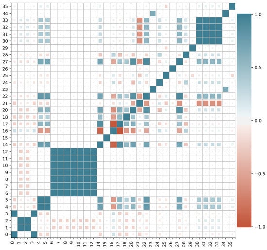 We first performed feature selection for the first stage ML model. We used a Random Forest ML algorithm (as it performed best in our previous work [6]) to test each feature selection method. As observed from Table 4, the best performance was achieved using 19 features selected from feature correlation analysis with the accuracy of 99.46% and 96.19% for training and test sets, respectively. Figure 1 shows the correlation heatmap of features. From the figure, a high correlation is observed among the following groups: {1, 2}, {4, 5}, {6, 7, 8, 9, 10, 11, 12}, {17, 18}, {30, 31, 32, 33}. Since features 6–12 are highly correlated, we considered one feature from the group and discarded the remaining. Similarly, we selected one feature from each feature group {4, 5} and {17, 18} due to their high correlation and only one feature was selected from features 30–33 and the remaining were discarded. We also discarded features 0–3 as they represent time. Table 5 lists the 19 features selected from feature correlation analysis for the first stage ML model.