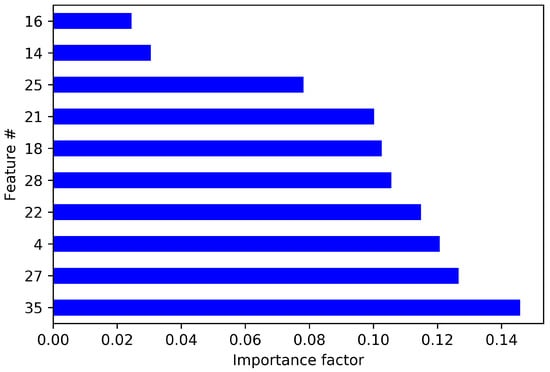 For the second stage ML model, we performed feature selection from the set of 19 features selected for the first stage. The results for the second stage feature selection are shown in Table 6. It is evident from the table that the best performance is achieved from the Feature Importance method. In Figure 2, the top 10 features with high importance are shown. Out of those 10 features, we selected features with the importance value greater than 1.0 resulted a total of seven features for the second stage: {4, 18, 21, 22, 27, 28, 35} from Table 3 or {0, 5, 7, 8, 13, 14, 18} from Table 5. Table 7 lists the features selected for the second stage ML model.