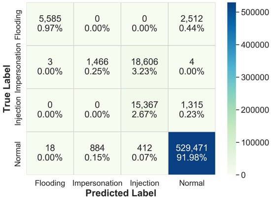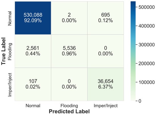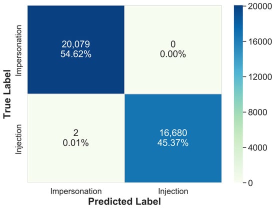 Table 8 shows the performance of ML algorithms on the training sets of both the stages. It is observed that Random Forest achieved the highest accuracy (99.57%) compared to other classifiers in the first stage. Similarly, the ML algorithm for the second stage was selected after comparing the performance of different ML models. The best performance was achieved using Naive Bayes algorithm with an accuracy of 100% and training time of 0.22 s. After the performance evaluation, we finalized Random Forest and Naive Bayes ML models for the first and second stages, respectively. We tested each ML model with the test sets. Figure 3 and Figure 4 show the confusion matrices for the first stage and second stage ML models on the test sets when they were evaluated independently. The 3-class ML model of first stage achieved an accuracy of 99.41%. The 2-class ML model of second stage that classifies impersonation and injection attacks achieved an accuracy of 99.99% (≈100%).