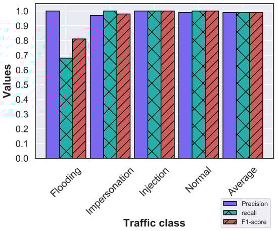 The proposed WNIDS combines the two-stage ML models in a sequence. As described earlier, the first model takes a record as input and classifies it as normal, flooding, or unified impersonation and injection traffic class. If the record is classified as the unified class, then it will be evaluated by the second ML model; otherwise, the prediction will be directly reported as an output of the WNIDS. The record sent to the second ML model will be classified as impersonation or injection class and reported as the output of the WNIDS. The two-stage WNIDS was evaluated with the AWID test dataset. Figure 5 shows the confusion matrix of 4-class classification by the two-stage WNIDS. The well-known classification metrics for the same is shown in Figure 6. From the figure, it is evident that the proposed model performs exceptionally well for classifying impersonation, injection, and normal records with an f-score of almost 1.0. The WNIDS achieved an accuracy of 99.42% and outperforming all the works reported in Table 1 for 4-class classification except [17,18]. However, the authors in [17] did not report computational time and f-measure values for each traffic class. In addition, we achieved the performance with 19 features compared to their 26 features. In Figure 5, it is observed that a significant number of flooding attack records are incorrectly classified into normal due to which the f-score for flooding attack is around 0.8 in Figure 6. Although flooding attack affects the availability of the network, it is not as critical as impersonation or injection attacks. The latter ones compromise confidentiality and integrity of data. Although the approach in [18] achieved an accuracy of 99.5% with a small set of features, our model performed very well for impersonation and injection attack classification. The two-stage WNIDS achieved detection accuracy of 99.86% and 99.5% for injection and impersonation attacks, whereas the approach in [18] achieved 100% and 93% for them.
