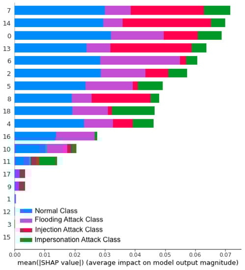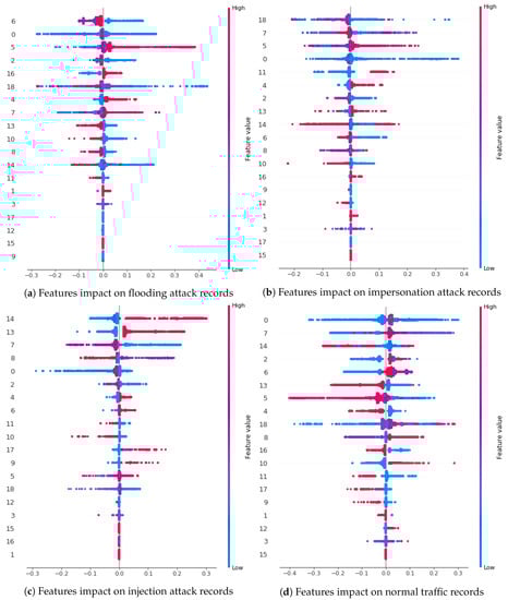 Although the influence of features on the prediction of each class can be seen in Figure 8, we provide a deeper inspection of the global impact of feature values on the prediction of each type of records in Figure 10. For example, the top five features that have a strong impact on flooding records are {6, 0, 5, 2, 16} (listed in Table 5), in which features 6, 0, and 2 have low values and features 5 and 16 have high values as shown in Figure 10a. These characteristics are common for almost all the records labeled as flooding. Figure 10b–d provide similar information for other classes. Table 9 lists the five most influential features and their values for the classification of each class based on Figure 8 and Figure 10. It is important to mention that the features reported as influential for impersonation and injection attacks by the XAI analysis are included in the second stage ML model as shown in Table 7.