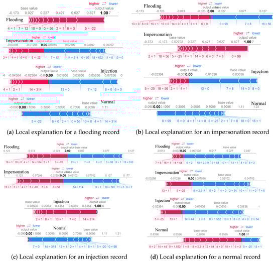 In our previous work [6], we used a Random Forest based model for 4-class WNIDS. Figure 7 shows the confusion matrix for the model. The accuracy reported for this ML model for the AWID test dataset was 95.88%. As seen in the confusion matrix, the majority of the impersonation records were incorrectly classified as injection records. Similarly, many flooding and injection records were labeled as normal. Having this outcome, we decided to analyze the important features that identify records for a particular class with the help of SHAP. We found a global explanation that includes all the records from the dataset for each feature. Figure 8 shows the influence of each feature for predicting records of a particular class. For example, the records predicted as normal are mostly influenced by feature 0, 2, 6, 7, and 14 (listed in Table 5). Similarly, the most influential features for injection and impersonation records are {7, 8, 13, 14} and {18, 7, 0, 5}, respectively. In addition to understanding the global explanation, a local analysis was performed for a few records using SHAP. Figure 9 shows the probability for a particular record to be predicted as either one of the attack or normal class. It is observed from the figures that the features interact with each other, pushing right or left the probability value until the probability reaches a final value to classify the record as one of the classes. Figure 9a shows the local explanation for a record with a flooding label. From top to bottom, the figure shows how likely it is for that record to be predicted as flooding, impersonation, injection, or normal. The interaction of values for each feature gave zero probability to be predicted as impersonation, injection, or normal, but a probability of 1.0 for flooding attack. A similar inference can be drawn for the records of other classes from Figure 9b–d.