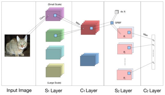 The HMAX model overview. The gray-value image is first processed by performing the convolution at four different orientations and eight scales (the full model uses 16 scales) through the S1 layer. The next C1 layer provides the local max (M) pooling over a neighborhood of the S1 layer in both scales and space. In the next stage, the S2 layer uses the GRBF unit with a set of patches which have been randomly sampled from a set of representative images []. At last, a global max pooling operation is provided over the S2 layer to generate C2 values.