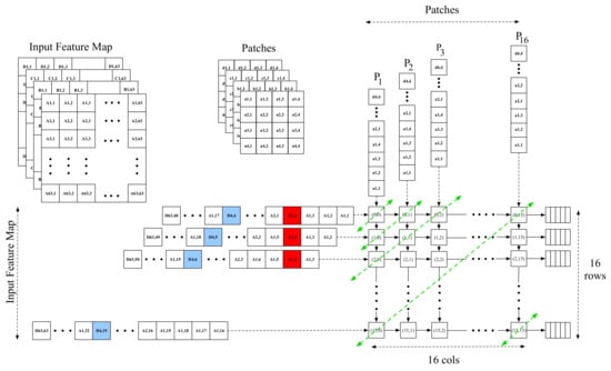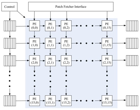 The blue values in Figure 4 each represent a final pixel in the C1 layer used to compute one output pixel. Once all the PEs are active, in every cycle, SAFA receives 16 input pixels and performs 256 subtract–multiply–accumulate operations with corresponding patch parameters. Each row’s PEs are responsible for output pixels for different patch groups, whereas each column produces the adjacent output pixels corresponding to the same patch group.