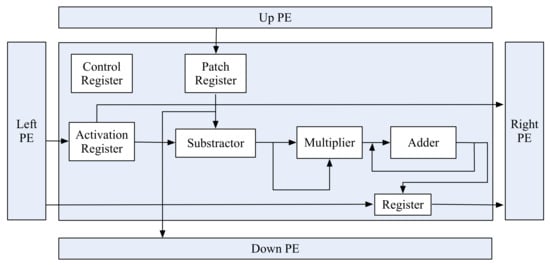 Differently from the traditional systolic array where the PE performs MAC operation, our designed PE implements subtraction, multiplication, and accumulation operations to carry out the reduced GRBF [] function in S2 layer (details are illustrated in Section 2). Compared with reconfigurable accelerators, such as CoRe16 or Park et al. [], our PE also does not use the multiplexers or other selectors to choose the available C1 layer input or patches. This also reduces the computational resource and helps to decrease the computing power for SAFA.