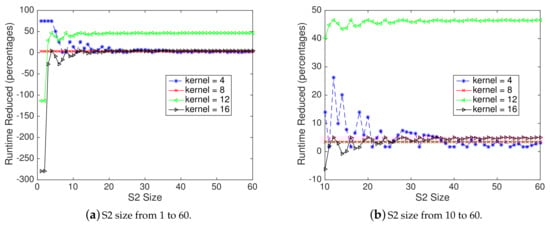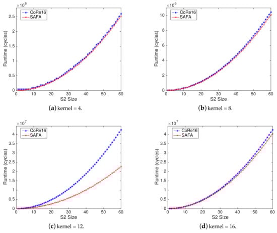 Figure 6b shows the percentage of SAFA runtime reduction compared to CoRe16 when S2 size ranges from 10 to 60 (since most of the calculations are concentrated on it). As can be seen, SAFA performs better than CoRe16 under different kernel sizes. When kernel size ranges from 4 to 16, the average runtime is reduced by 11.18%, 3.44%, 39.67%, or 2.5%, respectively.
