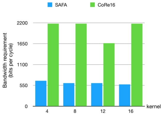 Meanwhile, as kernel size increases, the storage bandwidth required by SAFA gradually decreases and CoRe16 is almost unchanged except that the kernel size is 12. This is because, with the increase of kernel size, the single datum is multiplexed more times in SAFA at each cycle. CoRe16 calculates the output pixels of the larger kernels with the small one. In perfect combination matching (i.e., kernel size = 8 or 16), there is no change for the required bandwidth between them. The memory requirement reduction compared with CoRe16 is 3.24, 3.58, 2.74, or 3.78 times under kernel = 4, 8, 12, pr 16, respectively. Since when kernel size is 12, CoRe16 does not work at full load, the storage bandwidth of SAFA can be reduced by 3.53 times on average (except for kernel = 12) under different kernels.