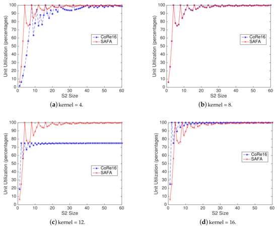 Unit utilization comparison for SAFA and CoRe16. SAFA performs well with a larger S2 size and reaches nearly 100% unit utilization under different kernels. This is because SAFA works more times at full load with a lager S2 size, resulting in fewer unused units.