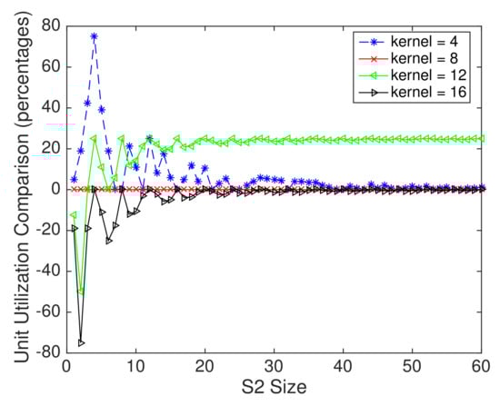 To better reveal the unit utilization comparison between SAFA and CoRe16, Figure 9 shows the percentage of SAFA unit utilization improvement compared to CoRe16 under different kernels. We can see that in most cases (except for kernel = 12), SAFA unit utilization is close or better than CoRe16. When the kernel equals 12 or 16, and S2 is small (less than 10), SAFA unit utilization performs not as well as CoRe16. This is because CoRe16 only processes one output pixel for one patch group in that case, whereas SAFA produces sixteen output pixels for one patch group. When S2 size is small, SAFA is more likely not to perform at full load.
