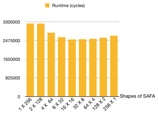 Runtime of SAFA in different shapes. Note that a square array () for SAFA achieves the shortest runtime.