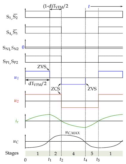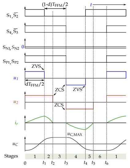 Figure 2 shows the operation waveforms of the proposed converter under fixed frequency modulation. The switching frequency under FFM is fixed at the resonant frequency given in Equation (1).