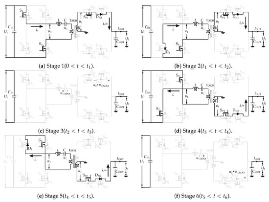- Stage 6 (Figure 3f) (): At the inductor current is zero and turns naturally off. Similar to Stage 3, blocks the negative voltage . Stage 6 lasts until the next sequence starts at .