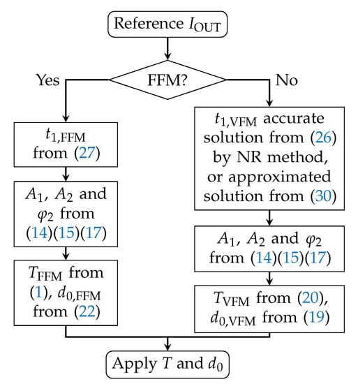 The open-loop modulation parameters (period T and phase shift ratio d) for this converter can be calculated from the reference output current , the input voltage and the output voltage . and are sampled and measured by the micro processor. The calculation process and results are given in this section. The flow chart for calculating the modulation parameters is illustrated in Figure 5.