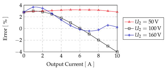 The actual output current controlled by the estimation value without a controller will unavoidably deviate from the reference value. The estimation errors at different output voltages are illustrated in Figure 6 using the parameters in Table 2. The values are calculated in MATLAB: the real values are calculated using the Newton–Rapson method (accuracy ), and the estimation values are calculated using the estimation method introduced in the paper.