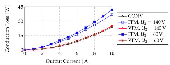 The input and output voltages can influence the RMS current by deciding and . The proposed converter under FFM causes the highest conduction loss due to its discontinuous current. The other two have a similar form of current, hence similar conduction loss. The conduction loss increases slightly at lower output voltage.