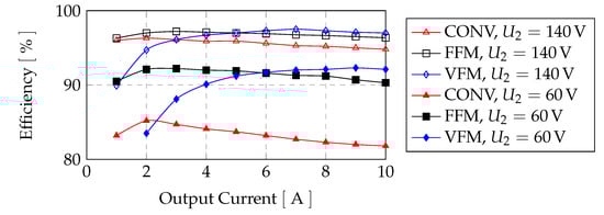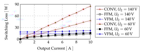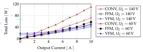 The switching losses play a more important role in light load cases, while the conduction losses dominate the total loss in heavy load cases. The proposed converter with VFM has a greater advantage in a heavy load range, and FFM is more suitable for a light load. With the increase in output voltage from 60V to 140V, the benefit range of VFM is widened from A to A. In comparison, the conventional converter causes the highest loss due to high switching loss.
