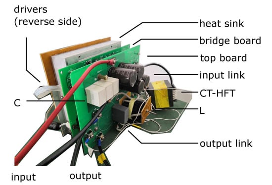 A kW prototype of the LC-DAB was built and tested to demonstrate the viability and effectiveness of the proposed topology and modulations (Figure 12). The prototype was built on a printed board by using MOSFET (IRPF4668, 200 V) on the input side and realizes a synchronous rectifier with MOSFET (IPW60R045CPA, 600 V) on the output side. The dead time of each switch pair was set at 2 μs. The controller is coded in DSP (TMS320f28374d, 200 MHz), and the modulation is generated through FPGA (EPM570T100I, 66 MHz). The control board is placed on opposite side of heatsink to minimize the impact of eletromagnetic interference. The ADC on DSP measures the output current, input voltage and output voltage. Then, the DSP calculates the switching frequency and duty ratio according to the modulation method and the PI controller introduced in Section 2 and Section 3. Then, the modulation parameters are sent to FPGA and the FPGA gives the gate signals to the drivers. The designed parameters of the prototype are listed in Table 2.
