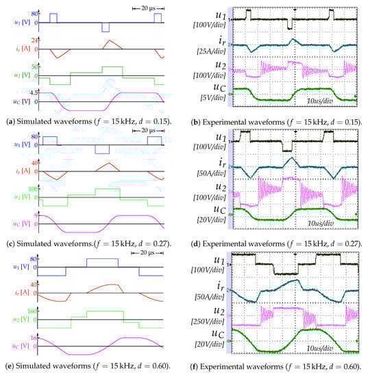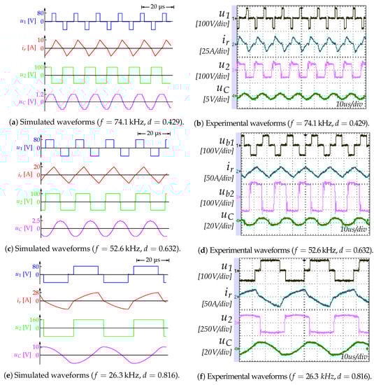 Figure 13 and Figure 14 illustrate the operation waveforms of the proposed converter with FFM and VFM under different operating points. The simulations are carried out in MATLAB under assumption that all devices are ideal without parasitic parameters. The simulated results can demonstrate the correctness of the theoretical waveform including gate signal sequence, duty ratio caluclation, reverse current blocking, etc., and compare with the experimental results. The simulated waveforms are on the left column and the experimental waveforms are on the right column under the same operation conditions. It shall be noted that the two cases have similar results, consistent with the description in Section 2. Figure 13a–f show the waveforms under FFM. The current returns and remains zero before the next switching action, which operates in DCM. Figure 14 depicts the waveforms under VFM. The results verify that the current is accurately predicted in Section 3 and Section 4, and BCM is achieved at the derived turns ratio and frequency.