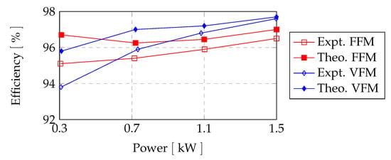 The power is measured at the input and output terminals using two sets of Juwei (300 V/100 A) DC power meters, and the curves in Figure 15 show a comparison of theoretical efficiency and experimental efficiency. Both results show the same trend and similar values. FFM achieves higher efficiency at a light load. In comparison, VFM shows better performance in experiments at heavy load, and the power efficiency at rated power kW reaches , higher than FFM.