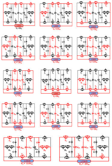 For this configuration, all the sources (V1, V2, and V3) of DC voltage have the same magnitude, i.e., V1 = V2 = V3 = . Therefore, the proposed topology with symmetric configuration can generate 13 levels at the output (six positives, six negative, and zero). All the switching states of this configuration are shown in Table 1. The switching diagrams for all the thirteen switching states are shown in Figure 2. In the switching description, the undotted line indicates the active circuit having current flow. The voltage across C1 and C2 will be half of the voltage V1, and voltage across C3 and C4 will be half of the voltage V3. Total standing voltage (TSV) is a parameter that was essential for inverter configuration selection. It is the sum of the absolute maximum blocking voltages through each switch. Also, there will be the same voltage stress for complementary switches. Therefore, according to the basic circuit given in Figure 1, voltage stresses across the switches: