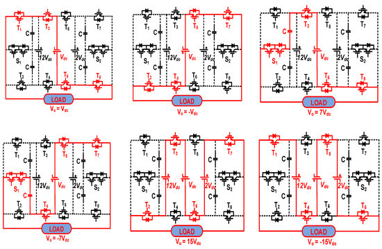 The same topology can generate more output levels using asymmetrical configuration. However, determining the appropriate ratio of the voltage sources to have maximum output levels was essential for lowering down the THD. After analyzing the combinations for the three DC voltage sources, the one with V1 = 12, V2 = , and V3 = 2 gave the highest number of output levels. Thirty-one output levels can be obtained using this combination of supply of DC voltage for the same topology. Table 2 shows distinct states of switching for the configuration. The switching diagrams for some of the 31 switching states are shown in Figure 3. Voltage stresses across the switches: