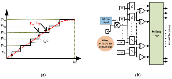 Modulation techniques are of great importance for multilevel inverters as they influence harmonics, control dynamics, switching loss, filter size, etc. [38]. Traditional modulation methods have the standard features of high switching loss, switching harmonics, increased switching frequency, and high complexity as submodules increases, etc. Nearest level control (NLC) has the advantage of having more voltage levels as it approximates the reference voltage with the nearest voltage level, which results in fundamental switching frequency having low switching losses [39]. This method was useful for higher output voltage applications as the switching losses and low-order harmonics were minimized. This method can operate at 50 Hz and is extendable to N-Levels. This method was more straightforward, and the round-off method was used for the calculation of normalized value. The amplified signal was obtained by multiplying the reference signal by A, as given in Figure 4b. After comparing the signals obtained with constants, the pulses thus obtained were combined according to logic for switching to get the required pulses of switching. NLC was applied for controlling the voltage at the output of the proposed multilevel inverter for both symmetric and asymmetric configurations. The working principle of the NLC is mentioned as part of Figure 4a,b. There was a variation in the reference voltage (Vref) to change the modulation index (MI), which is given as: