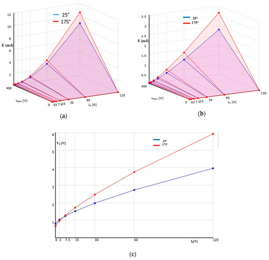 Losses in terms of power and efficiency in the overall sense of suggested topology were estimated by using PLECS software. Conduction and switching losses for all the switches and losses across the capacitors were calculated precisely using thermal modeling in the software. IGBT switch IGA30N60H3 manufactured by Infineon was taken for this analysis. The turn ON, turn OFF, and conduction loss model of the IGBT taken is given in Figure 5, respectively. Here three main types of losses were taken into account: switching losses () and conduction losses () of all the semiconductor devices and ripple loss () of the capacitors.